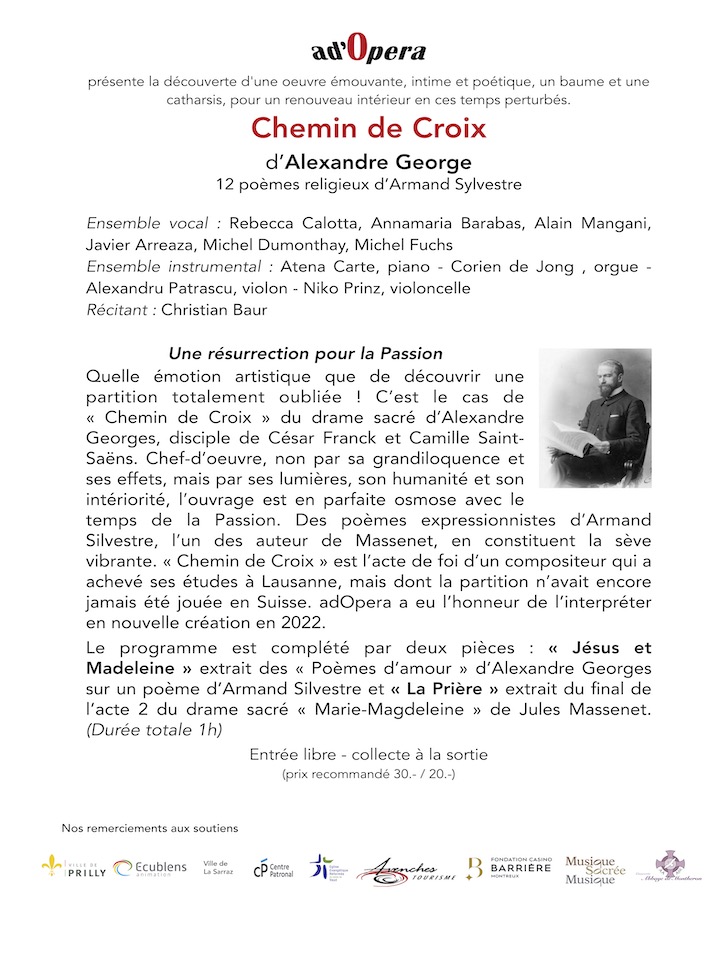 Jean Villard-Gilles, music-hall de poche, concerts narratifs, poétiques et spirituels tel que « Chemin de Croix » ou « Pastorale de Noël » et « Légende de St-Nicolas », ponctuent la saison de ses concerts et spectacles variés et destiné à tout public. ad’Opera présente aussi d’autres groupes ou artistes dans son calendrier. N’hésitez pas à consulter notre agenda d’événements. À tout bientôt!